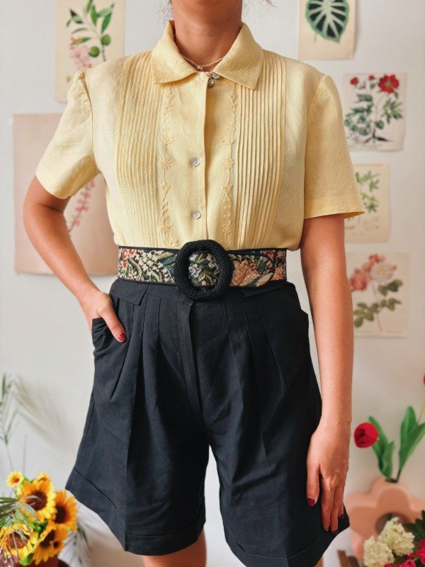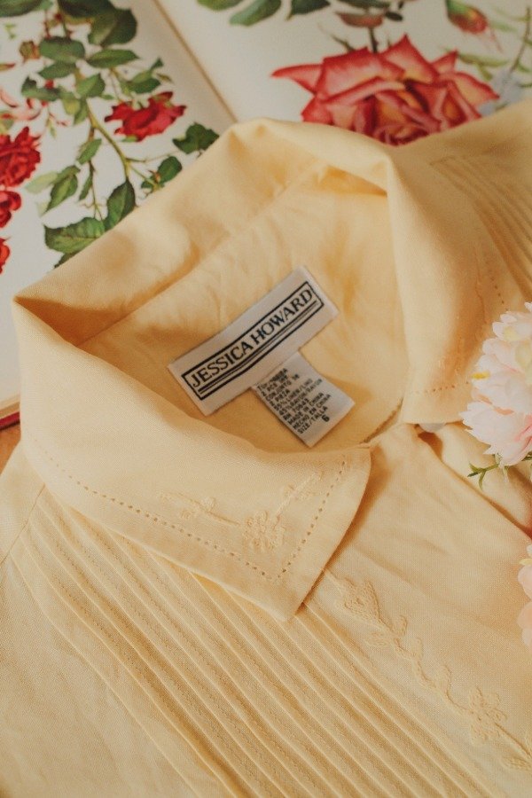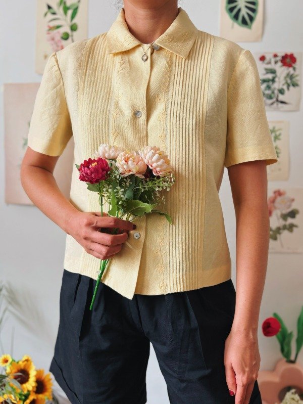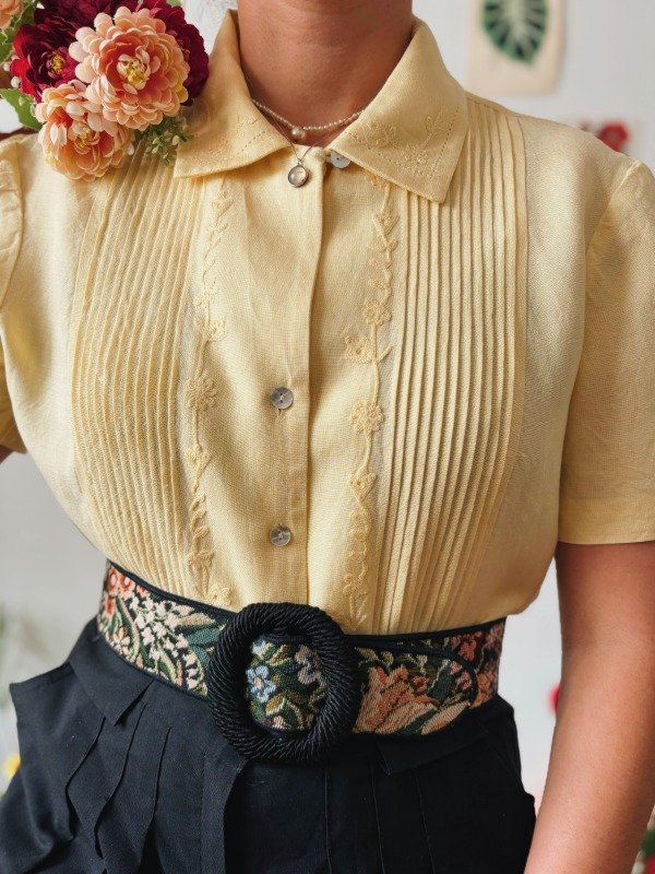 Camisa con tablitas y bordados en frente, bordados en el cuello. Tiene botones de nácar.