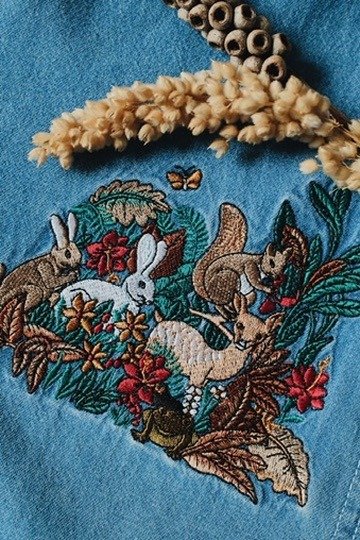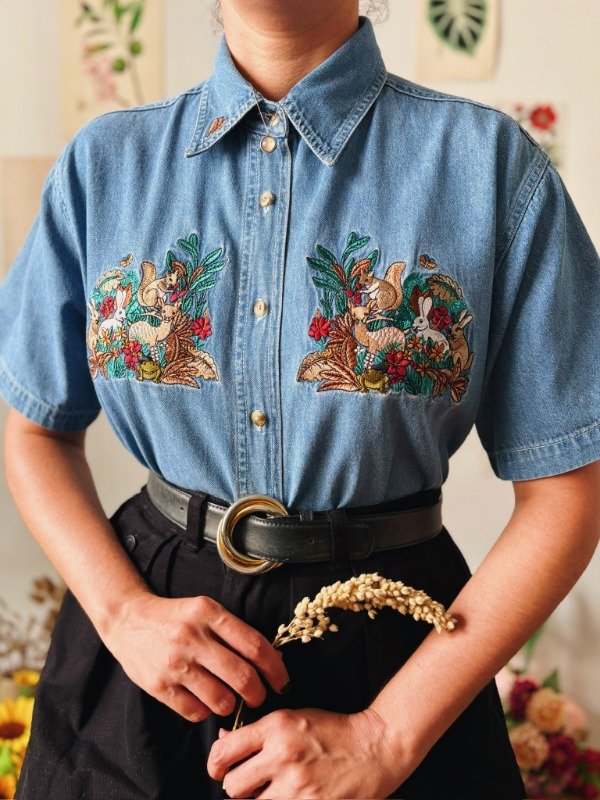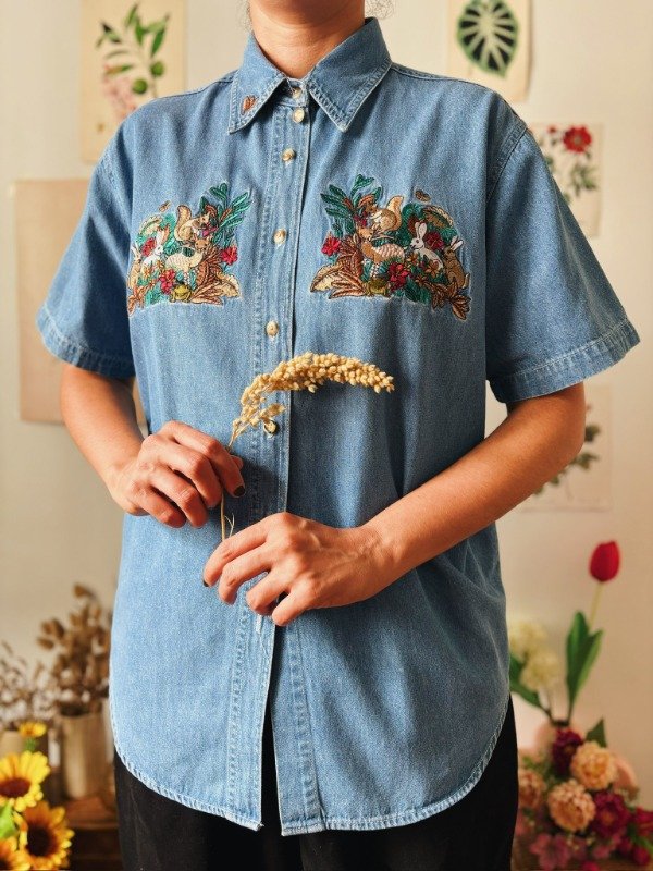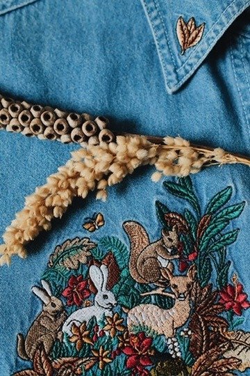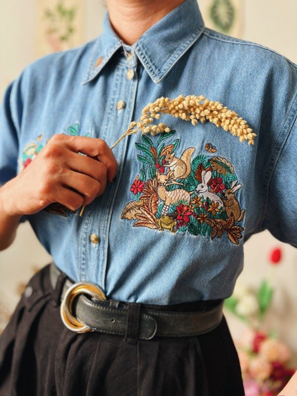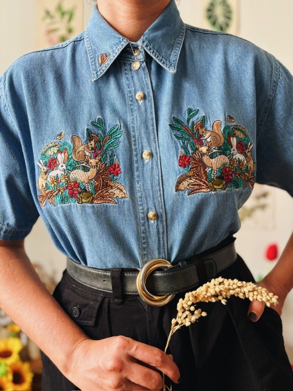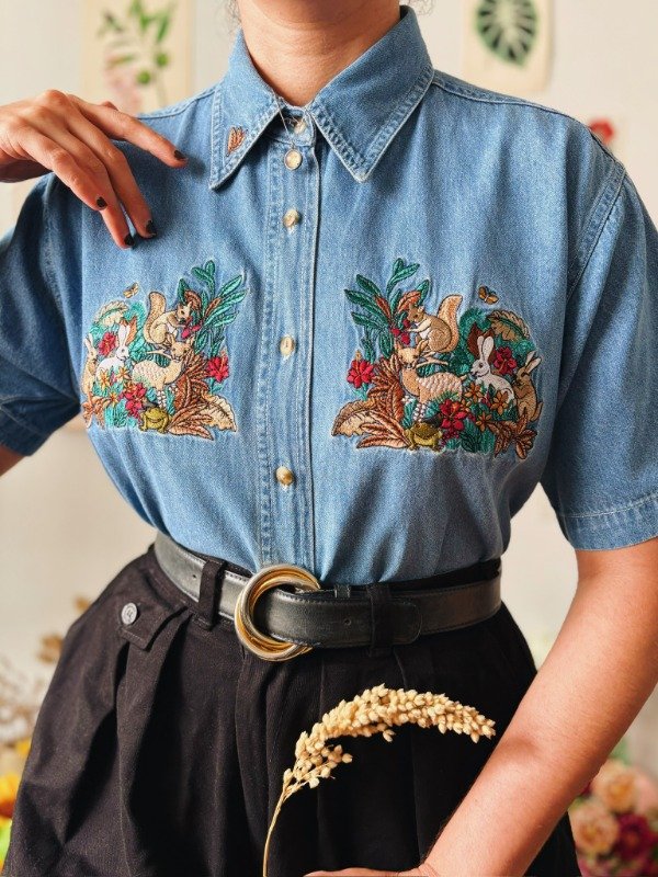 Camisa de jean con bordados en el frente y cuello.