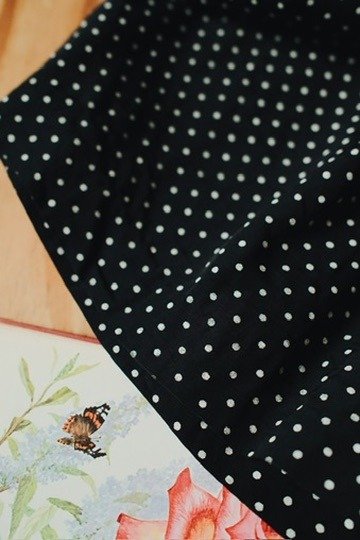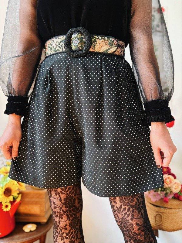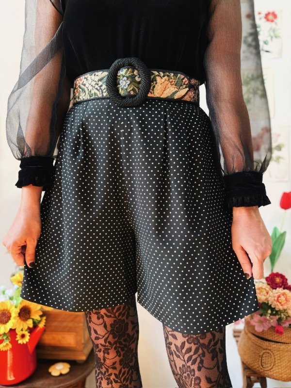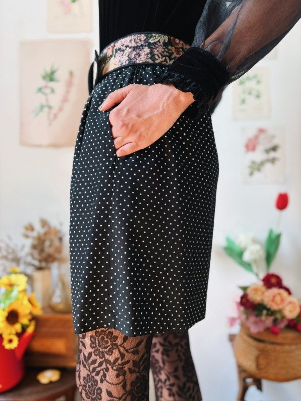 Short hecho en USA a lunares con tablas, bolsillos y elástico en la parte trasera de la cintura.